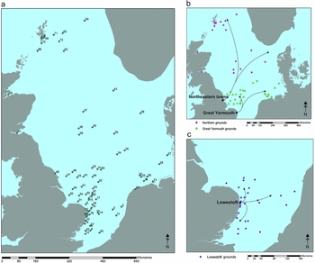 Figure 4. a) The range of historic trawling locations identified, see Table S2 in online supplementary material for corresponding numbers and co-ordinates; b) Great Yarmouth Grounds and Northern fleets; c) Lowestoft Grounds.