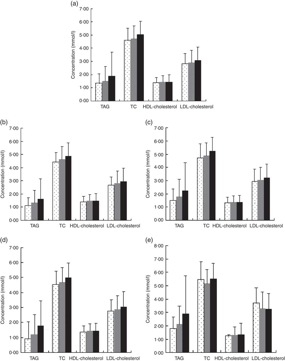 Fig. 1 Blood lipids according to type 2 diabetes (T2D) and central obesity status. (a) All subjects group, mean TAG, total cholesterol (TC), HDL-cholesterol, LDL-cholesterol (1·68, 4·87, 1·44, 2·98 mmol/l), (b) no central obesity group, mean TAG, TC, HDL-cholesterol, LDL-cholesterol (1·47, 4·74, 1·48, 2·88 mmol/l), (c) central obesity group, mean TAG, TC, HDL-cholesterol, LDL-cholesterol (2·02, 5·07, 1·37, 3·14 mmol/l), (d) No T2D group, mean TAG, TC, HDL-cholesterol, LDL-cholesterol (1·60, 4·82, 1·45, 2·96 mmol/l) and (e) T2D group, mean TAG, TC, HDL-cholesterol, LDL-cholesterol (2·52, 5·34, 1·33, 3·27 mmol/l). Values are means and 95 % CI represented by vertical bars.  , Low magnesium ≤0·65 mmol/l;