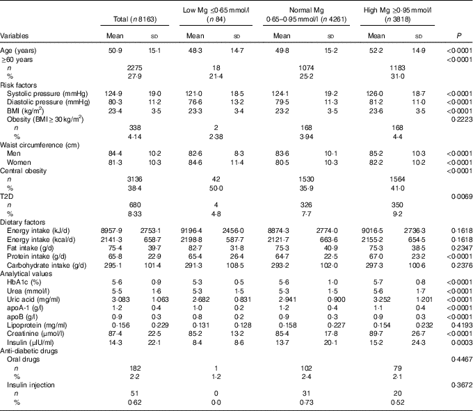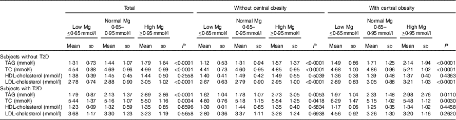 Differences between Mg groups in socio-demographic and clinical characteristics were evaluated by ANOVA for continuous variables and χ 2 test for categorical variables. In particular, we calculated and tested the differences in blood lipids among the three Mg groups and among T2D (yes/no) and central obesity (yes/no) subgroups.