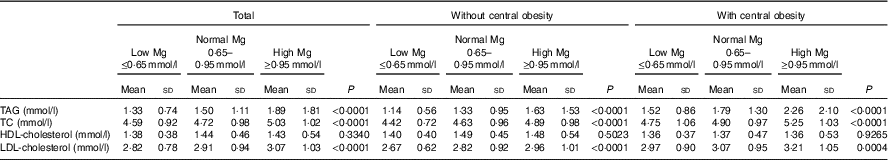 Table 2 shows blood lipid values in the whole group, according to central obesity category and Mg status. A significant increase in blood lipids, with the exception of HDL-cholesterol, across progressive Mg groups (from low Mg level ≤0·65 mmol/l, normal level 0·65–0·95 mmol/l to high level≥0·95 mmol/l) in all subjects was noted (P<0·05). This phenomenon was also detected in subgroups, regardless of whether they were with central obesity or not. In addition, when compared with those of the group without central obesity, the mean increments of TAG, TC, HDL-cholesterol and LDL-cholesterol of subjects with central obesity were 1·52, 4·75, 1·36 and 2·97 mmol/l in the group with Mg level ≤0·65 mmol/l; 1·79, 4·9, 1·37 and 3·07 mmol/l in the group with Mg level of 0·65–0·95 mmol/l; and 2·26, 5·25, 1·36 and 3·21 mmol/l in the group with Mg level ≥0·95 mmol/l. TAG, TC, HDL-cholesterol and LDL-cholesterol were significantly higher among subjects with central obesity compared with those without central obesity (P<0·05).