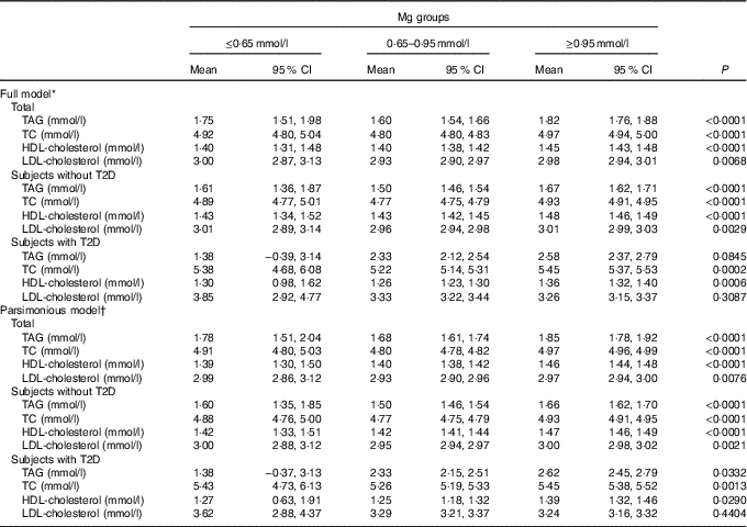 A generalised linear model of blood lipids (TAG, TC, HDL-cholesterol LDL-cholesterol) and Mg (three groups) was built adjusting for covariates, which included age (continuous), sex, BMI (continuous), WC (continuous), T2D (yes/no), anti-diabetic drug treatment (yes/no), insulin injection (yes/no), blood pressure(continuous), energy intake (continuous), fat intake (continuous), protein intake (continuous), carbohydrate intake (continuous), HbA1c (%), urea (continuous), uric acid (continuous), apoA-1 (continuous), apoB (continuous), lipoprotein (continuous), creatinine (continuous) and insulin (continuous).
