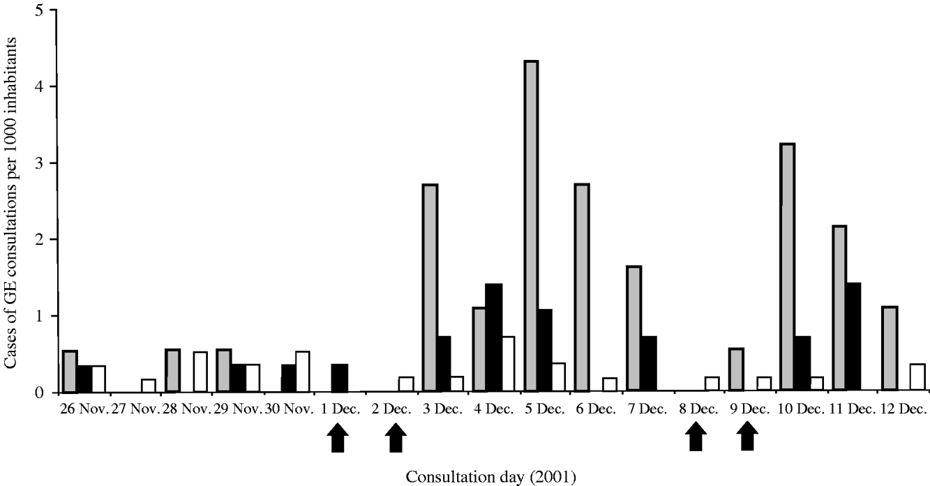 Fig. 3. Number of diagnosed cases of gastroenteritis per 1000 inhabitants, from 26 November to 12 December 2001, by day and area, exposed (A) and non-exposed (B, C) to consumption of grey water, The Netherlands, 2001. Arrows indicate weekend days., Area A; ■, area B; □, area C.