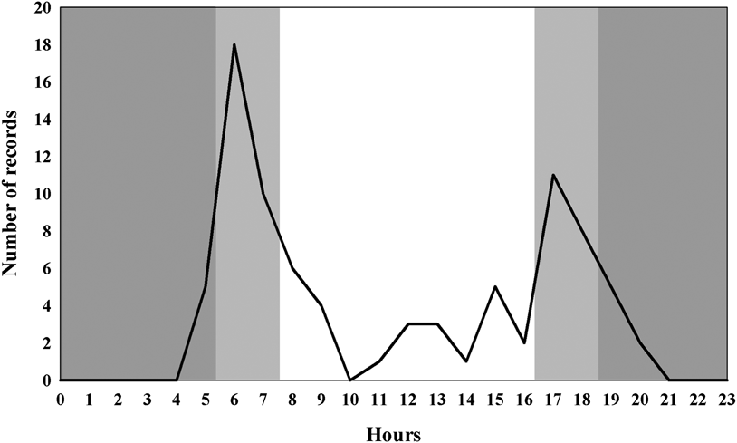 Each independent record (interval = 1 hour) of the species was classified as nocturnal, diurnal or crepuscular (after Van Shaick and Griffiths Reference Van Schaik and Griffiths1996). We collected times of sunrise and sunset throughout the year from the software Moonrise 3.5. The circadian pattern of the species was then determined according to Gómez et al. (Reference Gómez, Wallace, Ayala and Tejada2005).