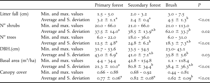 Table 1. Minimum value, maximum value, average and standard deviation for each measured environmental variable of each one of the three successional stages. (Different letters within a line indicate statistical difference at the level of probability, indicated in the P column).