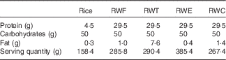 RWF, rice with fish; RWT, rice with soya beancurd (taukwa); RWE, rice with egg white; RWC, rice with chicken.