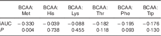 Table 3 Spearman’s correlation coefficients and P values for the relations between branched chain amino acids (BCAA):essential amino acids ratio and glycaemic response of different test meals