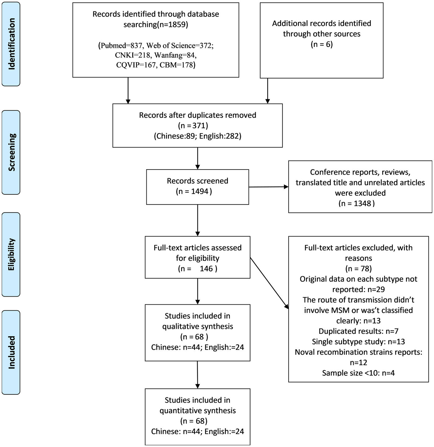 For determining the prevalence of different HIV-1 subtypes among the population of MSM in China, we found 68 independent studies that contained relevant data from 1865 records. The flow diagram in Figure 1 shows the identification process. A total of 1859 records were searched using different databases (PubMed = 837, Web of Science = 372; CNKI = 218, Wanfang = 84, CQVIP = 167, CBM = 178), and six records were searched using reference list tracing. After excluding 371 duplicates records, 1494 titles and abstracts were scanned and 1348 unrelated articles were removed. A total of 146 full-text articles were read, and 68 studies containing relevant data were included in the final study.