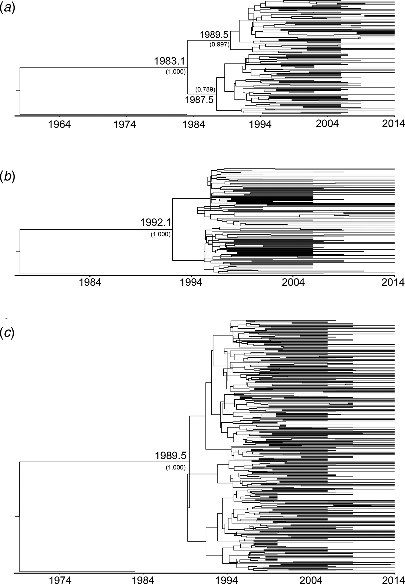 To estimate the evolutionary rates and the time of most recent common ancestor (tMRCA) of the main HIV-1 genotypes circulating in Yunnan, Bayesian MCMC analyses were performed using gag sequences from the present and previous studies[Reference Chen10, Reference Su15]. With the relaxed exponential clock model, the median evolutionary rates of CRF01_AE, CRF07_BC and CRF08_BC were 5.12 × 10−3, 1.14 × 10−2 and 9.87 × 10−3 substitutions site−1 year−1, respectively. Under these substitution rates, the median tMRCA for CRF01_AE, CRF07_BC and CRF08_BC circulating in Yunnan were estimated to be 1983.1, 1992.1 and 1989.5, respectively (Fig. 2).