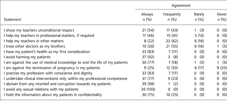 | I believe that medicine should be practised according to the Hippocratic Oath | 33 (83) | 7 (17) |