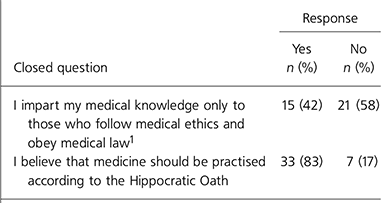 | I impart my medical knowledge only to those who follow medical ethics and obey medical law1 | 15 (42) | 21 (58) |