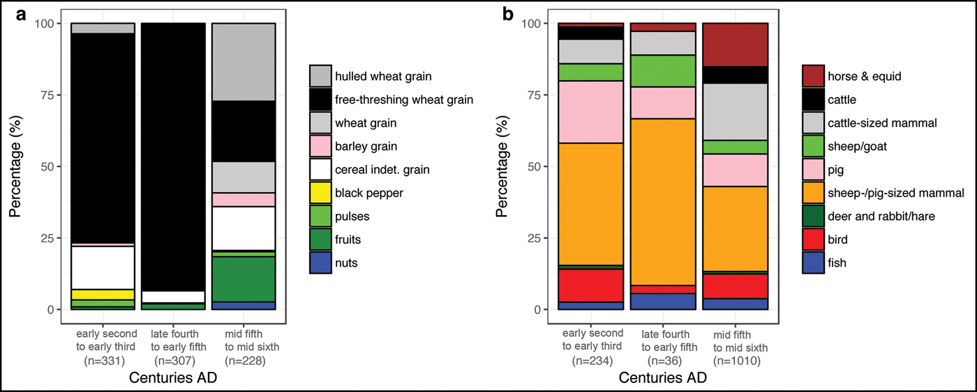Plant and animal remains provide direct evidence for food, traded goods, building materials, fuels and the local environment. Imported staples and exotic goods were perhaps consumed alongside local products. The small quantities of exotics provide clear biogeographical evidence for maritime trade—notably early third-century AD charred black pepper seeds imported via Egypt from India (van der Veen & Morales Reference van der Veen and Morales2015), late fifth-century containers made of African ostrich eggshell, as well as two bear metapodials (cf. Ursus arctos) and a probable dorsal thoracic rib from a Nile crocodile (cf. Crocodylus niloticus). Both crocodiles and bears were probably used in the spectacles held at Rome, the former imported live from Egypt (MacKinnon Reference MacKinnon2006), and the latter either from Europe or possibly a now extinct subspecies from the Atlas Mountains of North Africa (Hamdine et al. Reference Hamdine, Michaux and Thévenot1998). Such exotics could only have formed minor dietary components—consumed infrequently, if at all—and therefore would have contributed little to the isotopic signatures of the site's inhabitants. Thus, the focus of this article is the principal dietary staples, represented by charred cereal grains and faunal remains, the latter predominantly domestic ungulate bones.