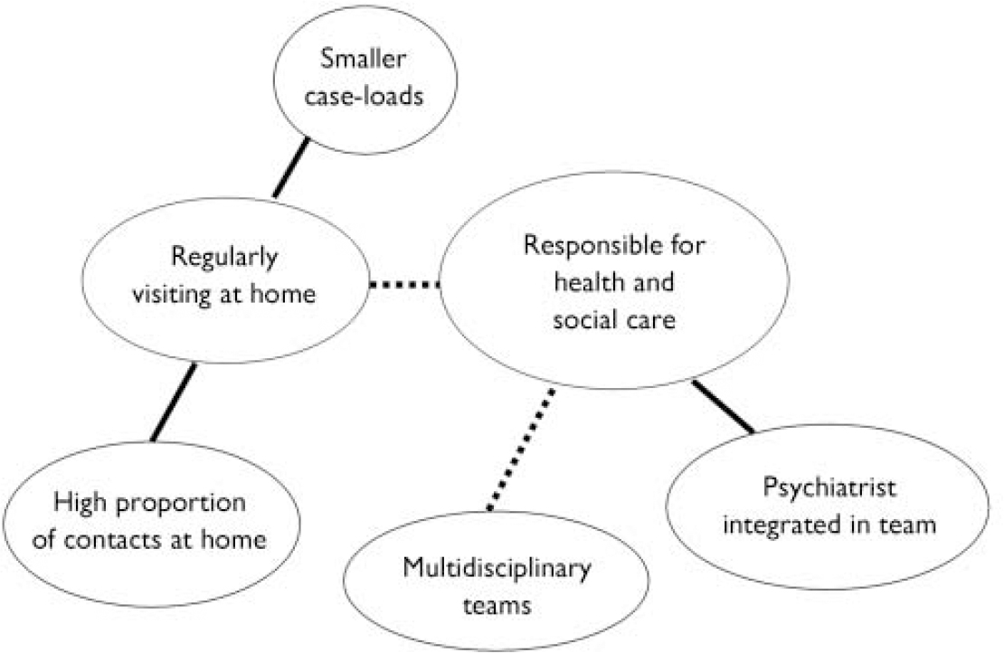 A subsequent study has demonstrated even more convincingly the utility of hospitalisation as an outcome measure to exploit differences in trials (Reference Burns, Marshall and CattyBurns et al, 2005). Meta-regression analysis allows skewed, non-parametric data to be used in a meta-analysis (Reference ThompsonThompson, 2001) and allows for multi-site studies to be analysed as, effectively, several independent studies. Substantially the same set of studies as those used in the home-based care review were used to obtain patient-level data. Hospitalisation data were assessed using an accepted model fidelity scale (Reference McGrew, Bond and DietzenMcGrew et al, 1994). This approach demonstrated that baseline bed use was the factor most strongly associated with reduction, but of the model fidelity factors it was predominantly the structural rather than staffing characteristics of the intensive approach which accounted for the outcome differences.