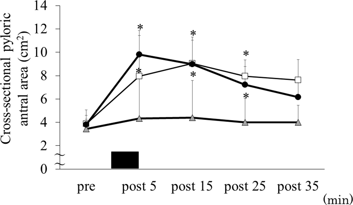 Several previous studies suggest that the antrum is the most suitable area to evaluate the stomach capacity (for a review of this, see Van de Putte et al. (Reference Van De Putte and Perlas19)). Pyloric antral area measurements were performed using a 2D ultrasound machine (LOGIQ-e; GE Healthcare) and a 5·0 MHz sector transducer. All metals were removed from the surrounding area to avoid the possibility of interference during acquisition. To optimise precision, the transducer was positioned vertically to obtain a parasagittal image of the pyloric antrum, with the superior mesenteric vein and the abdominal aorta in a longitudinal section, as described previously(Reference Van De Putte and Perlas19). After obtaining these signals for measuring pyloric antral area for 1 min at 09.00, 09.35, 09.45, 09.55 and 10.05, the pyloric antral area (cm2) was determined using an image-editing software (ImageJ 1.47; National Institute of Mental Health). The gastric contractions of the pyloric antral area were defined as the frequency of contractions per 1 min.