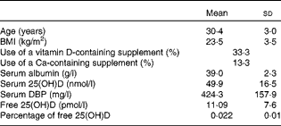 Baseline characteristics of the thirty pregnant women at 15 weeks of gestation are presented in Table 1. The age range of the participants was from late 20s to early 30s, with an average BMI of 23·5 kg/m2. Of these participants, one-third were taking a vitamin D-containing supplement, with a daily dose ranging from 2·5 to 10 μg/d, and 13 % were taking a Ca-containing supplement. The calculated free 25(OH)D concentration was 0·02 % of the total serum 25(OH)D. Age and BMI were not associated with DBP, total or free 25(OH)D. Both age (β = − 0·367, P= 0·047) and BMI (β = − 0·333, P= 0·067) were negatively associated with albumin concentrations at 15 weeks of gestation (P= 0·053) and together accounted for 20 % of the variability in albumin concentrations at baseline. Consumption of vitamin D or Ca-containing supplements was not associated with total or free 25(OH)D concentrations at 15 weeks of gestation, which may be due to the small sample size and relatively small dosage.