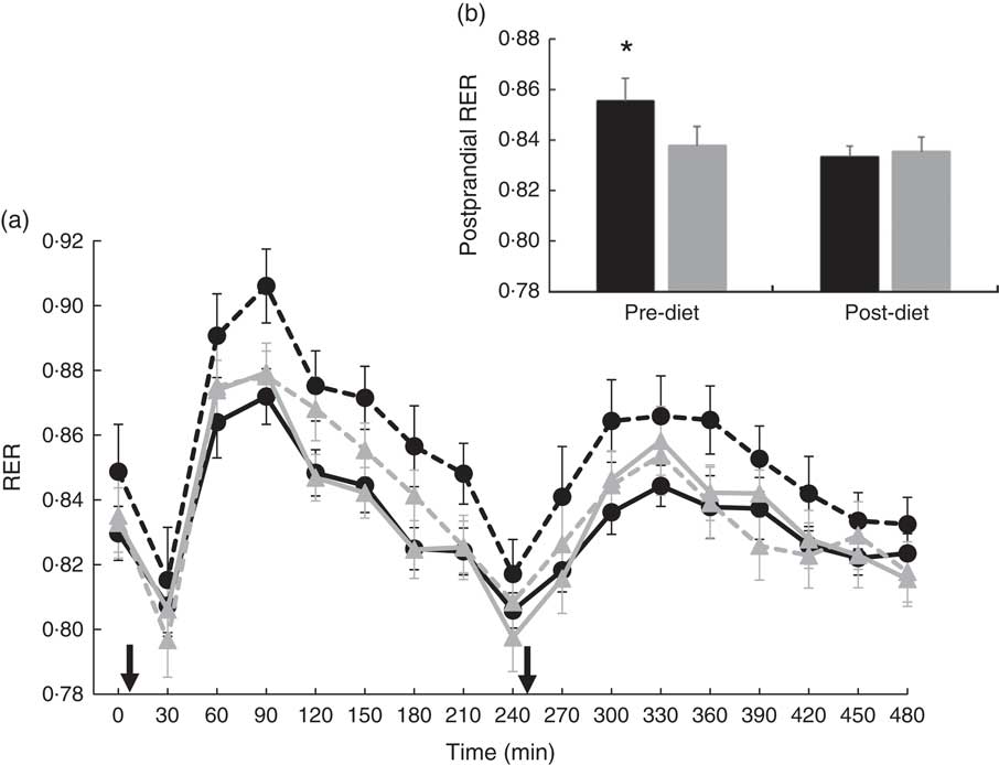 ). (b) Average postprandial RER for pre- and post-diet interventions. Values are means with their standard errors. a: