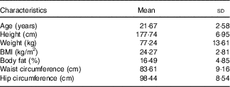A total of fifteen normal-weight male participants completed both feeding trials. Physical characteristics of the participants are shown in Table 3. Participants were between 18 and 45 years of age and were of normal weight based on BMI (18–24·9 kg/m2) or DXA body fat percentage (14–24 %). All participants were also free from any known metabolic or chronic disease and were not taking any medications.