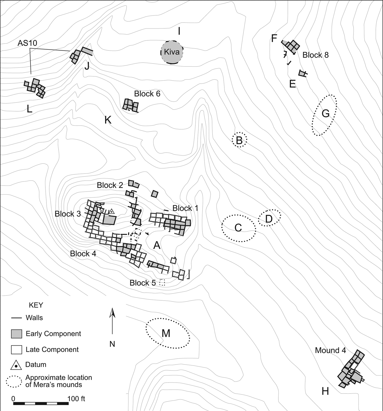 Figure 3. Composite plan of Tijeras Pueblo (LA581) showing excavated rooms and kivas. Areas of the site that are associated with early component (before AD 1370) construction dates are shaded in gray (based on Cordell and Damp Reference Cordell, Damp, Brown, Armstrong, Brugge and Condie2010:Figure 2). Unexcavated room blocks or excavated room blocks for which there are no known plans are shown in their approximate location using H. P. Mera's original mound designations (based on Judge Reference Judge1974:Figure 1).