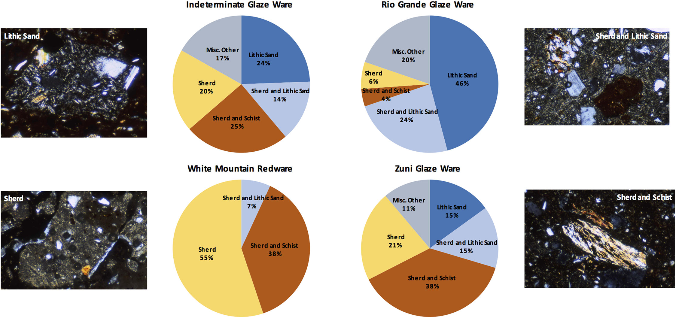 Visual sorting of ceramic pastes, verified by petrographic identification, demonstrated that the overwhelming majority (more than 80%) of glaze-painted pottery recovered from Tijeras Pueblo could be assigned to one of four temper groups: lithic sand, sherd and lithic sand, sherd and schist, or sherd (Figure 6). All refired chips could be assigned to one of two broad paste color categories: red (Munsell 5YR5/6-8; 5YR6/6-8; 7.5YR6/6-8; 7.5YR7/6) or white (Munsell 7.5YR8/3-4; 10YR8/3-4). Although the four major temper categories were identified across all three glaze ware categories—Zuni Glaze Ware, White Mountain Red Ware, and Rio Grande Glaze Ware—combined refired paste color and temper patterns were noted that we interpret as reflecting possible regional preferences in resource selection and processing strategies (Table 2).