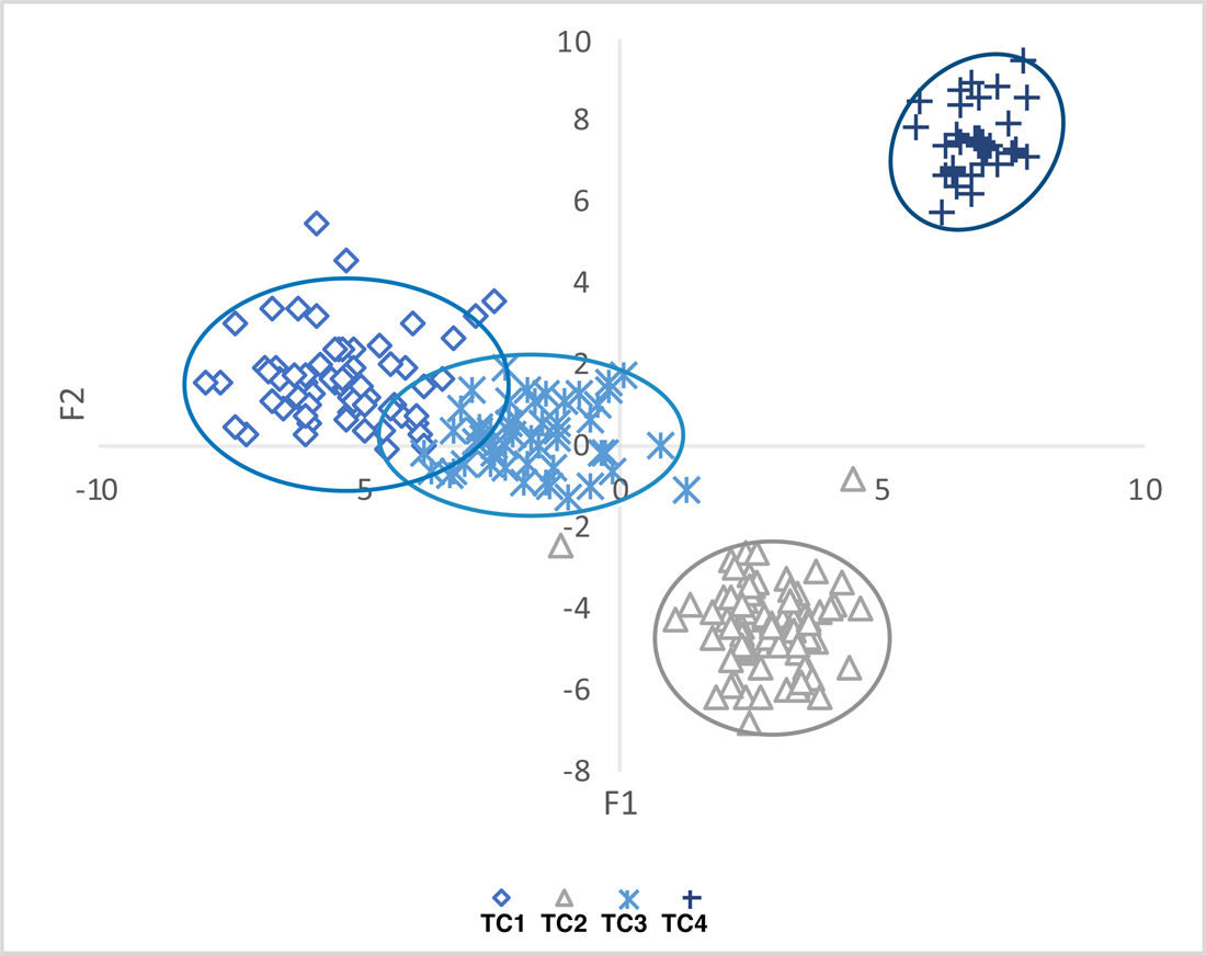 Figure 7. Plot of NAA results for Tijeras Pueblo (LA581) glaze ware sample. First two functions of DA analysis plotted by k-means 4-cluster solution. Ovals represent 95% confidence interval for membership. (Color online)