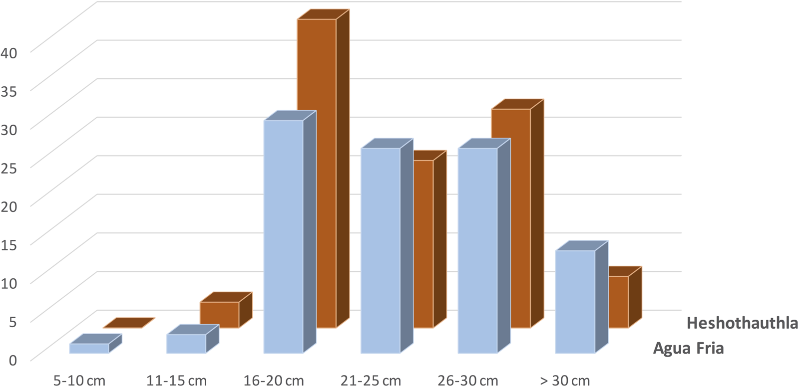 Figure 8. Comparison of the relative distribution of bowl rim diameters (in centimeters) between Agua Fria Glaze-on-red (83 measurable rims) and Heshotauthla Glaze Polychrome (60 measurable rims) vessel fragments from Tijeras Pueblo (LA581).