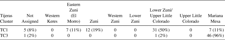 In some instances, the 10-cluster solution separated samples from the same archaeological district; this is not surprising, because we combined statistical core groups from previous studies into the same district. In other instances, the 10-cluster solution grouped samples from different districts into the same cluster; this is also not necessarily surprising given that some clay-bearing geological formations crosscut these districts. Ultimately, though, we are concerned here with the Tijeras Pueblo samples and so focus only on those clusters that have Tijeras Pueblo samples as core members. TC3 provides the clearest results (Table 3), occurring in a cluster that consists only of TC3, TC1, and samples from Techado Spring Pueblo (LA6010) in the Mariana Mesa district; 96% of the TC3 samples, 68% of the Techado Spring Pueblo samples, and 11% of the TC1 samples group in this cluster. We are currently comfortable interpreting these results as suggesting that the majority of the TC3 samples were produced in the Mariana Mesa district. TC1 is more diverse, but 50% of the samples cluster with the combined Lower Zuni River (Jaralosa Draw)/Upper Little Colorado core group samples. We interpret these results as suggesting that most of the TC1 samples are from pots that were likely produced in either or both geologically similar districts. The rest of the TC1 samples can be assigned to the Zuni district (19%), the El Morro district (11%), and the Mariana Mesa district (11%).