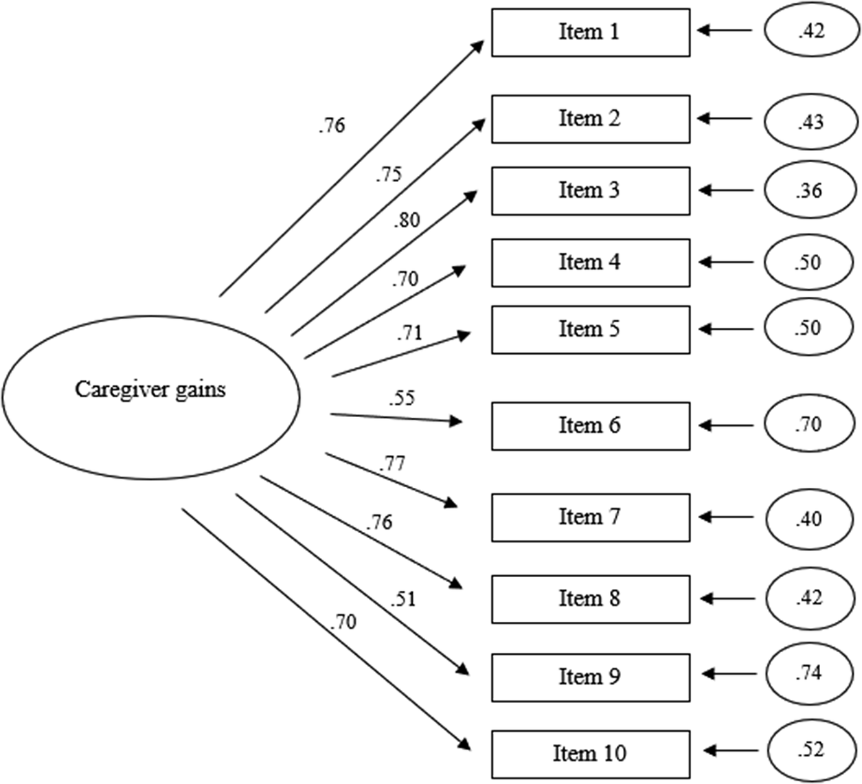 Based on the latter three categories, Yap et al. (Reference Yap, Luo, Ng, Chionh, Lim and Goh2010) developed the Gain in Alzheimer Care Instrument (GAIN) to measure the benefits of caring for a person with dementia. This instrument comprises 10 items, the first four of which refer to personal growth, the following three to gains in relationships, and the final three to higher-level gains. The authors performed an exploratory factor analysis (EFA) and principal components analysis (PCA) and concluded that the GAIN had a unidimensional structure. They also examined correlations between GAIN scores and caregiver burden (measured with the Zarit Burden Interview, ZBI), dementia management strategies (evaluated using the Dementia Management Strategies Scale, DMSS), and positive aspects of caregiving (Positive Aspects of Caregiving scale). This analysis showed that GAIN scores were negatively correlated with burden (ZBI) and criticism (DMSS), and positively correlated with positive aspects of caring and with encouragement (DMSS) and active management (DMSS).