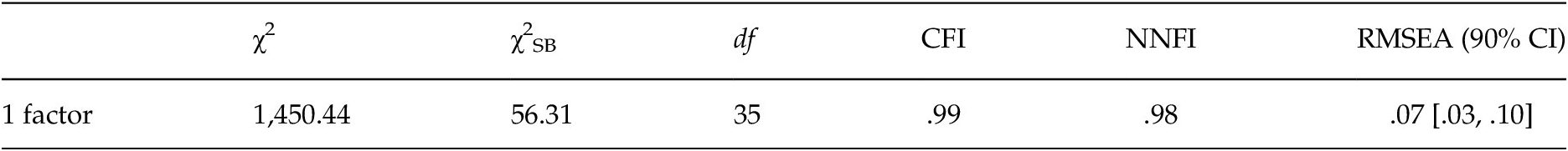 Note. N = 113. χ2 = chi-squared statistic, χ2SB = Satorra-Bentler chi-squared, df = degrees of freedom, CFI = comparative fit index, NNFI = non-normed fit index, RMSEA = root mean square error of approximation, with a 90% confidence interval.