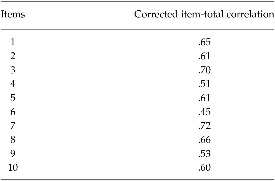 For the item analysis we computed corrected item-total correlation coefficients, which indicate the correlation between a given item and the total test score when that item is omitted. Values above .30 are considered satisfactory (De Vaus, Reference De Vaus2002; Traub, Reference Traub1994).