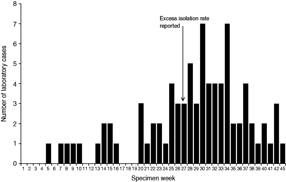 Between 5 July and 31 October 2010, 54 human isolates of pan-susceptible S. Typhimurium DT8 were confirmed by SRU, 83% (45) and 17% (9) were identified from England and Northern Ireland, respectively. No cases were identified from Wales or Scotland. Figure 1 shows the number of laboratory-confirmed cases of S. Typhimurium DT8 by week of confirmation by SRU. For 2010, this amounted to 81 confirmed human cases for all regions of England and Northern Ireland by the end of October, an increase of 26% (60) and 41% (48) on 2009 and 2008, respectively. Sixty-one per cent (50/81) of cases were male. Ages ranged from <1 to 80 years (median 47, inter-quartile range 33–61 years). Five of the cases were hospitalized and one death was reported.