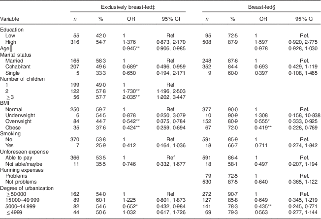 Table 2 Adjusted OR and 95 % CI of exclusive breast-feeding (n 600) and breast-feeding (n 700) at 4 months of ageFootnote † among Norwegian infants, Early Food for Future Health study, March–October 2016