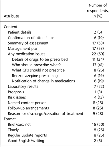 Of the 45 practices targeted, 32 returned completed questionnaires, representing a 71% response rate. Relevant individual comments on returned questionnaires were then categorised in an attempt to identify common themes that emerged from the large number of varied responses. These major attributes and components of correspondence to GPs thus identified are presented in Table 1.
