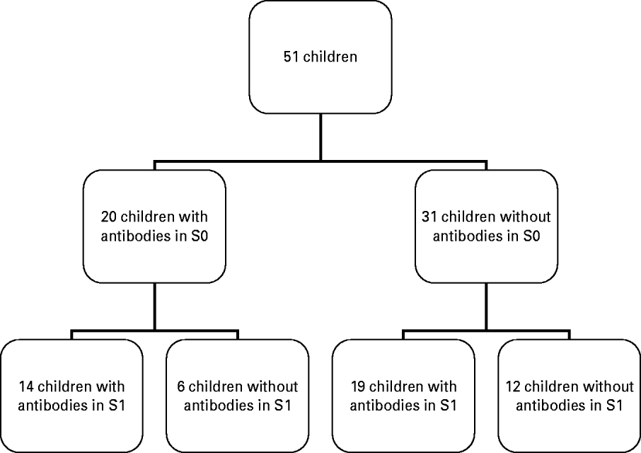 Mean S0 titres in children in whom no antibodies were detected in S1 were lower (GMTS0: 242·23±1·34 mIU/ml) than in children in whom antibodies were detected in S0 and S1 (GMTS0: 393·25±1·88 mIU/ml; GMTS1: 575·10±1·87 mIU/ml; P=0·002). This latter level of S1 was also higher than in children who seroconverted (GMTS1: 262·96±1·75 mIU/ml; P>0·05).