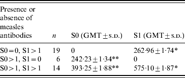 Table 2. Distribution of antibody titres (GMT) according to the presence or absence of antibodies in S0 and S1
