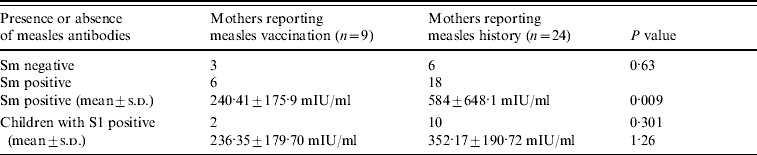 Antibody titres in mothers who reported having had measles were higher than in those reporting having been vaccinated (P=0·009) (Table 3). There were no significant differences in antibody titres between children of vaccinated mothers and those who had had measles. In seven mothers, the titre detected was >1000 mIU/ml and passive antibodies were not detected in two of their children.