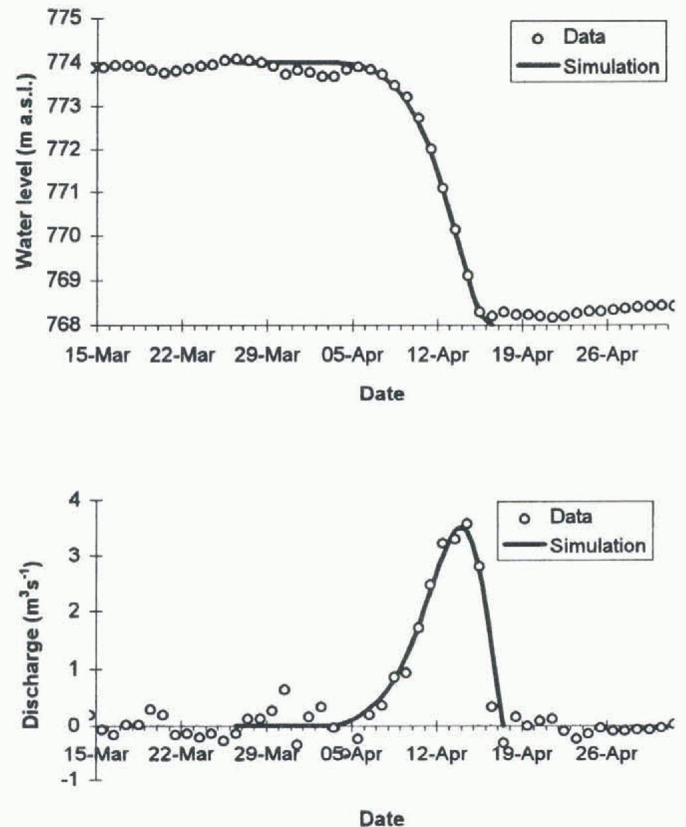 Fig. 4. Water level in Heiavatnet (above) and derived net discharge (below) from the lake during the 1991 outburst event (circles), and results of simulation using model M2 with