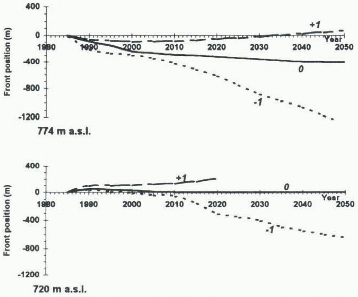 The model was tuned for Svartisheibreen using data on glacier geometry, mass balance (using also data from Engabreen, 13 km further north, prior to 1988) and ice velocities, and was then run for combinations of three mass-balance and two lake-level scenarios: net balance excluding calving, b nʹ. equal to +1, 0 and −1 m a−1; and lake level equal to 774 and 720 m a.s.l. A separate mass-balance model (Laumann and Reeh, 1993) shows that an increase in net balance of 1 m a−1 on Svartisheibreen would result from a change in air temperature throughout the year of approximately −1.2°C, or in precipitation of approximately +30%. The results in Figure 3 show that b nʹ ≈ 0.5 m a−1 is required to maintain the current front position with a lake level of 774 m a.s.l., consistent with measurements. A balance of b nʹ = 0 m a−1 would cause a steady retreat due to calving loss. This retreat is likely to be more pronounced over the first 5 years or so, as thinning would cause the lower part of the tongue to float and break off.