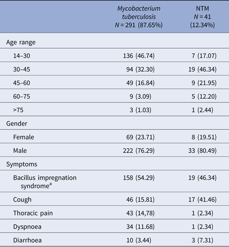 Table 1. Socio-demographic and clinical characteristics of tuberculous and non-tuberculous mycobacteria (NTM)-infected patients, from 2006 to 2013 in Bamako, Mali