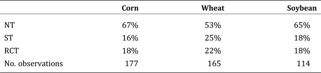 The approach used to estimate the parameters of the multinomial logit model given by equation 1 is the method of maximum likelihood. The parameter estimates, though, are not readily interpreted. Thus, to determine the effect of each predictor variable on the probability of choosing a specific alternative, the marginal effects given by the first derivative of the probability of choosing a tillage practice with respect to a change in an explanatory variable are commonly used. The standard errors for the marginal effects were computed using the delta method (Greene Reference Greene2003). In the multinomial logit, only the parameters of J alternatives out of J + 1 can be estimated. In this study, the RCT group in the corn, wheat, and soybean models were used as the base choice when estimating the models. A summary of tillage practice use by crop is reported in Table 1.