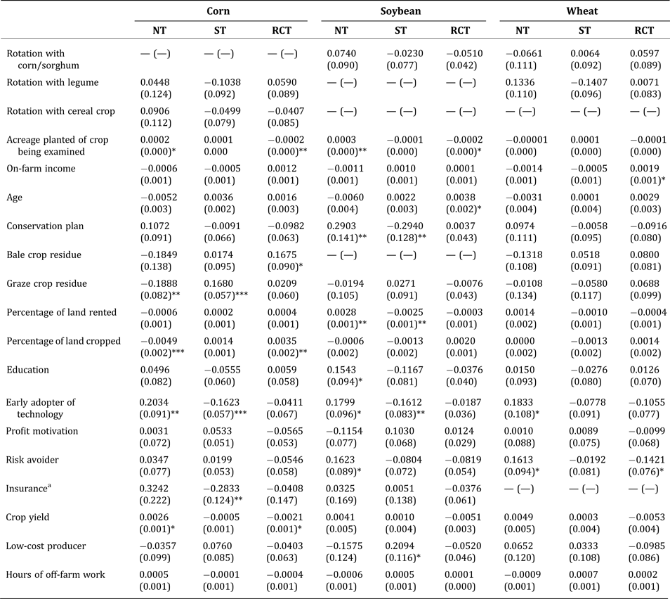 Note: ***, ** and * indicate the estimated coefficients are significantly different from zero at the 1 percent, 5 percent and 10 percent level of significance. Numbers in parenthesis represent the standard deviations of the estimates. NT, no tillage; ST, strip tillage; RCT, conventional and reduced tillage.