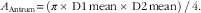 $$A_{{{\rm Antrum }}} {\equals}\,(\pi \,{\times}\,{\rm D1}\,{\rm mean}\,{\times}\,{\rm D2}\,{\rm mean)\,/\,4}{\rm .}$$