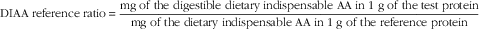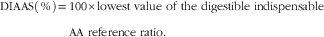$$\eqalign{ {\rm DIAAS }\left( {\rm \,\%\,} \right) & {\rm {\equals} 100{\times}lowest}\,\,{\rm value}\,\,{\rm of}\,\,{\rm the}\,\,{\rm digestible} \ {\rm indispensable} \cr & \quad{\rm AA}\,\,{\rm reference}\,\,{\rm ratio}{\rm .}$$