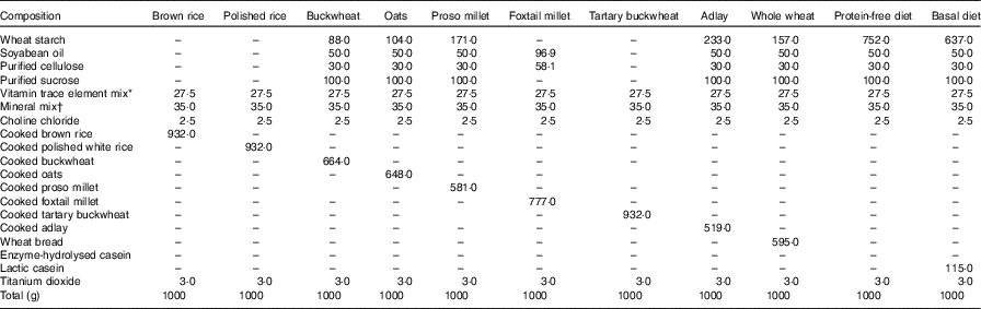 Brown rice, polished white rice, oats, tartary buckwheat, buckwheat, foxtail millet, proso millet, adlay and wheat were used. Adlay was purchased from the Guizhou Province, while oats and foxtail millet were procured from Inner Mongolia. The other cereal grains were obtained from Northwest A&F University. Wheat was baked into wheat bread according to the national standard (LST 3204-1993). The other cereal grains were soaked for 30 min with 25°C deionised water. The cereals were then cooked using a commercially available cooker as described by the manufacturer. The respective proportions of brown rice, polished white rice, oats, tartary buckwheat, buckwheat, foxtail millet, proso millet or adlay to water were 1:1·6, 1:1·6, 1:2·3, 1:20, 1:20, 1:1·8, 1:1·9 or 1:1·4 (w/v), respectively. All the cooked materials were freeze dried after cooking, and all the materials were ground through a size-60 mesh before inclusion into the diets.