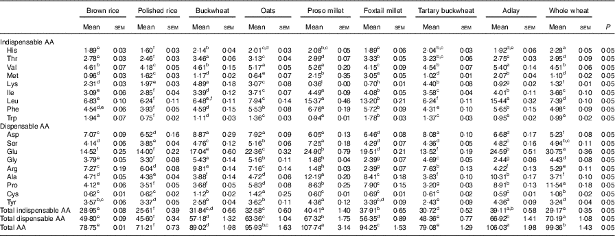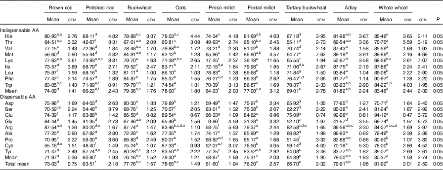 Table 4 Mean apparent ileal digestibility of amino acid (AA) in brown rice, polished rice, buckwheat, oats, proso millet, foxtail millet, tartary buckwheat, adlay and whole wheat (%) (Mean values with their standard errors)