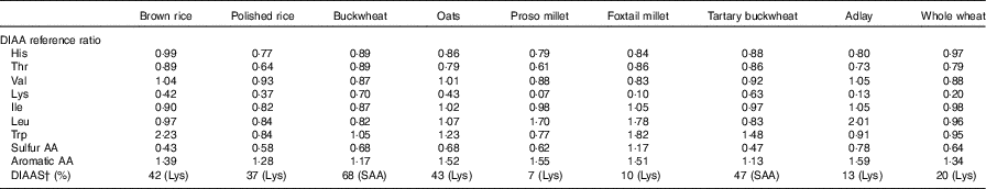 Table 7 Digestible indispensable amino acid scores (DIAAS) for brown rice, polished rice, buckwheat, oats, proso millet, foxtail millet, tartary buckwheat, adlay and whole wheatFootnote *