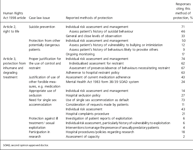 Table 1 shows how absolute human rights were largely described as being protected through individualised risk assessment and management. Few details were given of how specifically this might protect rights. In addition, local policy was cited as protecting patients against unjustified use of restraint and seclusion. National legislation, mainly the Mental Health Act 1983, was viewed as one of two main methods of protecting against forcible measures such as tranquillisation.