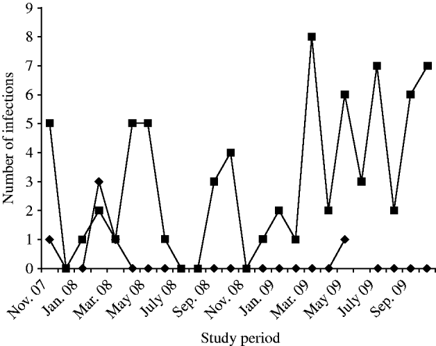 Fig. 1. Detection of NVGI (–◆–) and NVGII (–▪–) infections in diarrhoea cases in Kolkata, India from November 2007 to October 2009.