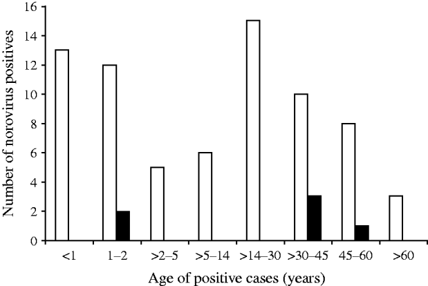 Fig. 2. Age distribution of norovirus positives detected in Kolkata, India from November 2007 to October 2009. ▪, NVGI; □, NVGII.