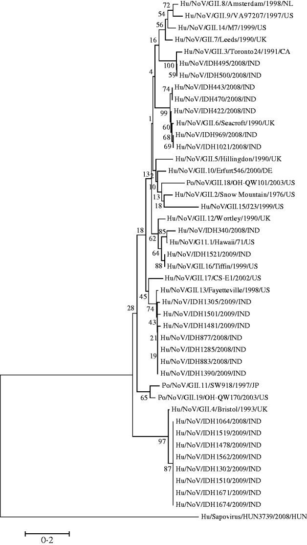 Norovirus (NoV) is the leading cause of non-bacterial, acute gastroenteritis and has been associated with gastroenteritis in infants, young children and adults in developed as well as developing countries [Reference Fankhauser1–Reference Glass, Parashar and Estes4]. NoVs are non-enveloped, icosahedral viruses and possess a linear, positive-sense, single-stranded RNA (ssRNA) genome of about 7·4–7·7 kb. NoV belongs to the Caliciviridae family. The RNA genome of NoV is organized into three major open reading frames (ORF1, -2, -3) with a polyadenylated 3′-end [Reference Jiang5]. Furthermore, ORF1 encodes a large polyprotein that is proteolytically processed into the mature non-structural proteins [Reference Liu, Clarke and Lambden6]. ORF2 encodes the major capsid protein, VP1, and ORF3 encodes a minor structural protein, VP2. NoV has five major phylogenetic clades, or genogroups, designated GI to GV [Reference Zheng7]. The prevalence of antibody to the GII viruses (Mexico, Hawaii, or Lordsdale) appears to be greater than that of the GI viruses in most studies [Reference Glass, Parashar and Estes4, Reference Cubitt, Green and Payment8]. Like all enteric viruses, NoVs are associated with several modes of transmission. The predominant modes of transmission are person-to-person contact and food- or water-borne transmission [Reference Fankhauser1, Reference Boxman9]. Clinical manifestations associated with NoV infections include nausea, vomiting, diarrhoea, abdominal cramps, headache, fever (subjective), chills, myalgia and sore throat. Vomiting was more frequently associated with diarrhoea in children, whereas in adults the reverse was observed. The duration of illness may range from 2 h to several days, with a mean or median of between 12 h and 60 h [Reference Kaplan10]. RT–PCR, coupled with sequence analysis of amplicons, has been used extensively to detect and characterize NoVs in various outbreaks. A preliminary report in 2000 showed that NoVs were associated with diarrhoea in the coastal region of southern India [Reference Kang11]. Since then many studies from different parts of the country showed NoV as another important cause of gastroenteritis. This study reports the detection and molecular characterization of NoVs, which play an important role as a viral aetiological agent of acute watery diarrhoea besides rotavirus in eastern India. The objectives of the study were (1) to describe the epidemiological behaviour of NoVs in Kolkata during a 2-year study including seasonal and clinical patterns, (2) to show co-infections with other pathogens such as bacteria, parasites and other viruses, namely rotaviruses, adenovirus, astrovirus or sapovirus, and (3) to understand the phylogenetic relationship of NoV detected in Kolkata with other NoV strains reported from other countries.
