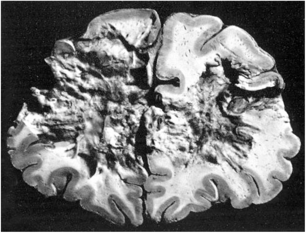 Figure 3: Post-mortem photograph of the brain of a patient who died following prefrontal lobotomies performed by Freeman and Watts. The brain had been cut in the coronal plain at the level of the lobotomies. The lobotomies produced extensive damage and cavitation of the white matter and destruction of the cortex through which the instrument used for the lobotomies had been introduced. Source: Figure 57 from Ref. [26].