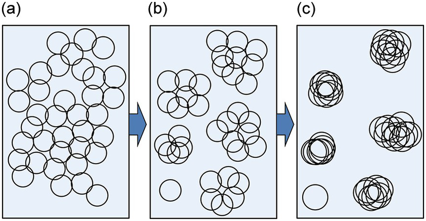 Figure 3.1 Convergence of groups of practitioners and their questions and ideas leads to cohesion around certain topics, and the abandonment of others. From left to right: (a) individual researchers all investigate different domains and issues; (b) through interaction they come to focus on certain kinds of information, certain methods and techniques, and certain questions to the detriment of others; (c) ultimately, they form coherent communities focused on more and more narrow domains.